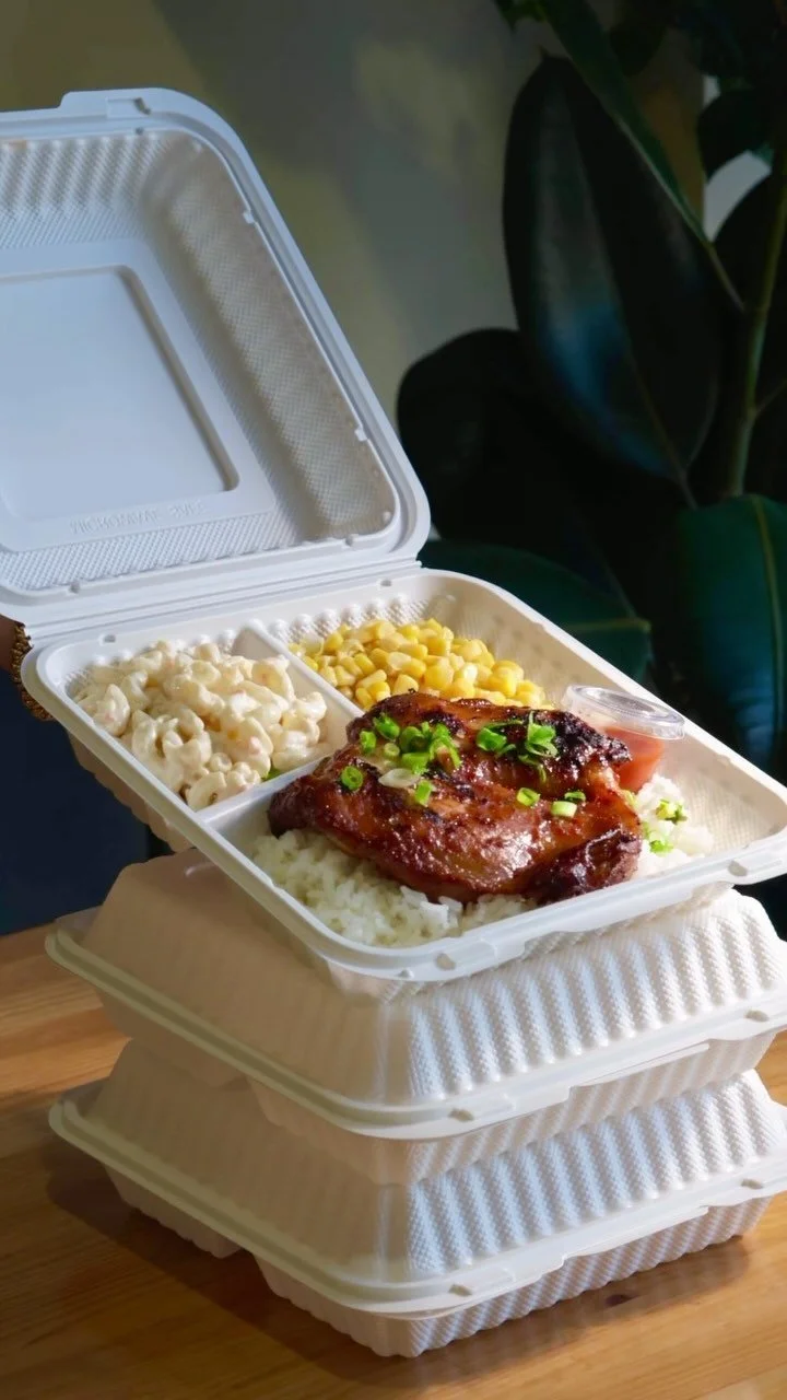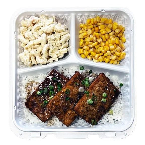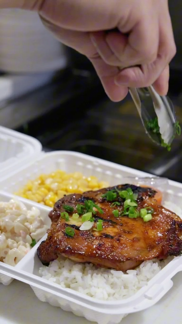 Our plate lunch meals comes with two scoops of white rice, one scoop of macaroni salad, a side of corn and your choice of proteins